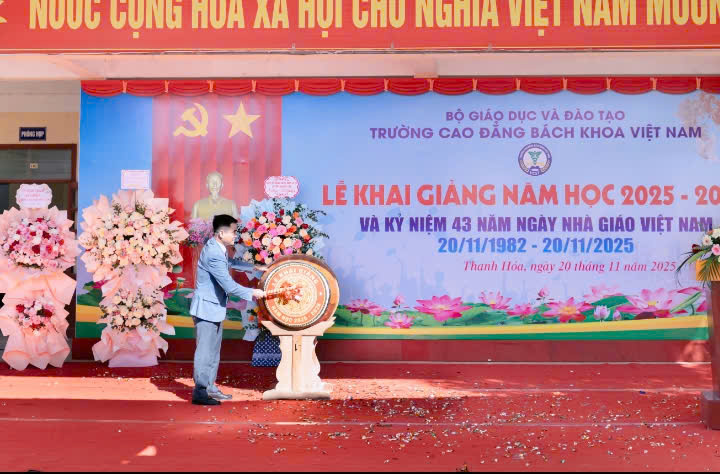 Ngày 20/11/2025, Trường Cao đẳng Bách khoa Việt Nam tổ chức Lễ khai giảng năm học 2025-2026 trong không khí rộn ràng và đầy kỳ vọng, với sự hiện diện của đông đủ các đại biểu khách mời, gồm: đại diện Lãnh đạo Sở Giáo dục và Đào tạo tỉnh Thanh Hóa; đại diện lãnh đạo UBND phường Nguyệt Viên; lãnh đạo các Trung tâm Giáo dục; đội ngũ giảng viên thỉnh giảng; lãnh đạo các Trường Cao đẳng, Đại học; các công ty, doanh nghiệp đối tác trong nước và quốc tế. Sự có mặt của các vị khách quý không chỉ thể hiện sự quan tâm, phối hợp của các cơ quan, đơn vị với nhà trường mà còn là nguồn động viên to lớn, tiếp thêm niềm tin và sức mạnh để tập thể thầy trò bước vào năm học mới với quyết tâm cao nhất.