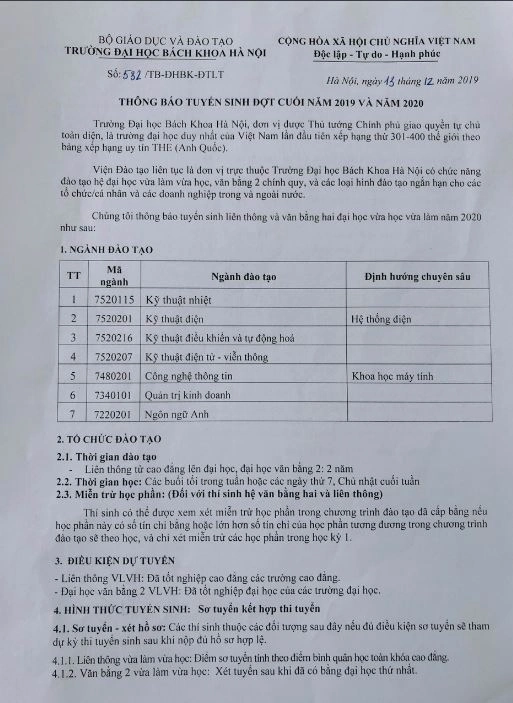 Thông báo tuyển sinh đại học liên thông, đại học văn bằng 2 đợt cuối năm 2019 và năm 2020 14/12/2019 Tin tức - Sự kiện Chia sẻ: