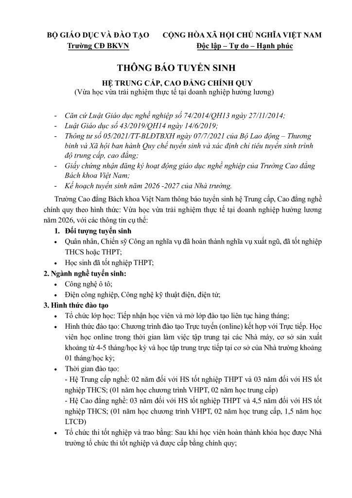 Trường Cao đẳng Bách khoa Việt Nam thông báo tuyển sinh hệ Trung cấp, Cao đẳng nghề chính quy theo hình thức: Vừa học vừa trải nghiệm thực tế tại doanh nghiệp hưởng lương năm 2026, với các thông tin cụ thể:
