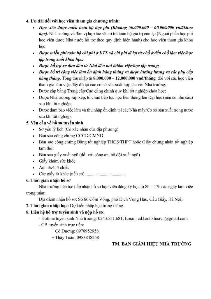 – Hotline tuyển sinh Nhà trường: 0243.551.681; Email: cd.bachkhoavn@gmail.com