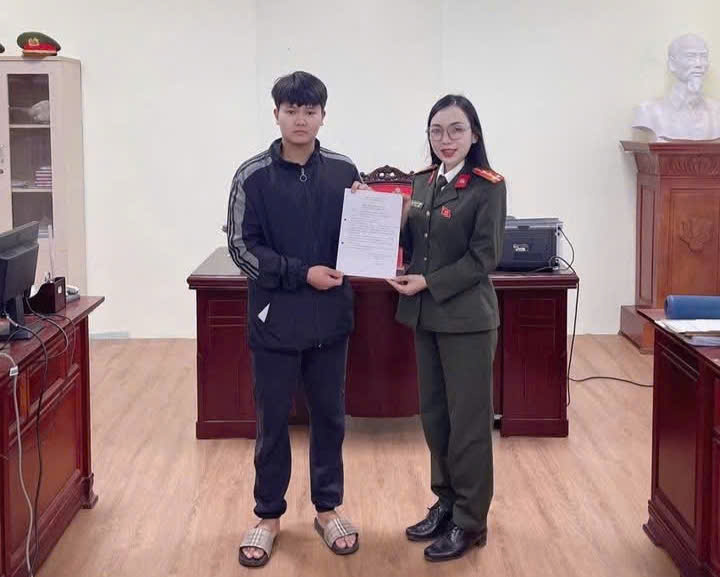 Sinh viên Lê Đình Tuân với lá đơn đăng ký nghĩa vụ công an nhân dân tại Công an phường Nguyệt Viên (ảnh: Công an phường Nguyệt Viên)