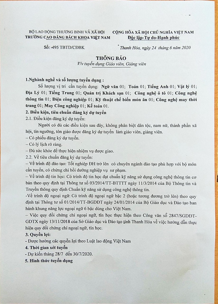Tin tức Thông báo về việc tuyển dụng cán bộ, giáo viên Ngày đăng: 6/24/2020 Lượt xem: 4798 Tin liên quan THÔNG BÁO TUYỂN SINH ĐẠI HỌC LIÊN THÔNG, ĐẠI HỌC VĂN BẰNG 2 ĐỢT CUỐI NĂM 2019 VÀ NĂM 2020 (14/12/2019) THÔNG BÁO TUYỂN SINH LỚP CẬP NHẬT KIẾN THỨC CHUYÊN MÔN VỀ DƯỢC (25/11/2019) Hoạt động tình nguyện của trường Cao Đẳng Bách khoa Việt Nam (04/07/2019) CÔNG NGHỆ THÔNG TIN – NGÀNH HOT ĐEM LẠI LỢI NHUẬN CAO NHẤT VIỆT NAM (08/05/2019) Việt Nam: Thiếu điều dưỡng nghiêm trọng (08/05/2019)