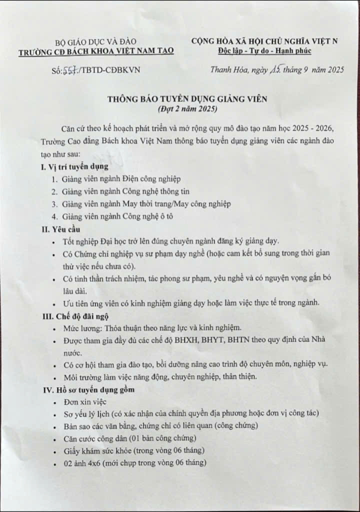 Nhằm mở rộng quy mô đào tạo năm học 2025–2026, Trường Cao đẳng Bách khoa Việt Nam tuyển dụng giảng viên các ngành: