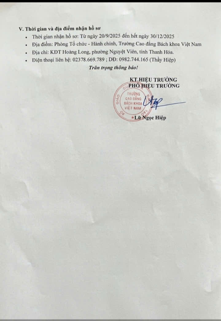 🏢 Nộp tại: Phòng Tổ chức – Hành chính, Trường Cao đẳng Bách khoa Việt Nam, KĐT Hoàng Long, P. Nguyệt Viên, TP. Thanh Hóa.